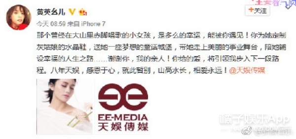 6、【09届快女#黄英宣布解约# 发文感激天娱八年栽培】6月18日,09届快女季军@黄英幺儿 发微博宣布与天娱合约到期,并不续约。黄英是2009年《快乐女声》的第三名,比赛结束后,黄英与天娱签下八年合约。八年合约到期后,黄英在微博中写道:“八年天娱,感恩于心,就此暂别,山高水长,相爱永远!”