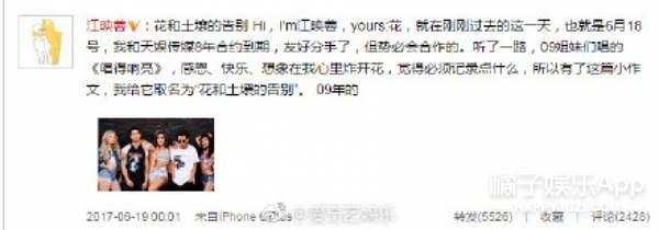5、【09级快女冠军江映蓉宣布与天娱解约】今天凌晨,09级超女冠军@江映蓉 发文宣布与@天娱传媒 解约。她表示这是一场友好的分手,感谢8年来天娱传媒与湖南卫视的栽培,并写了一片小作文“花和土壤的告别”来记录八年来自己的成长故事。