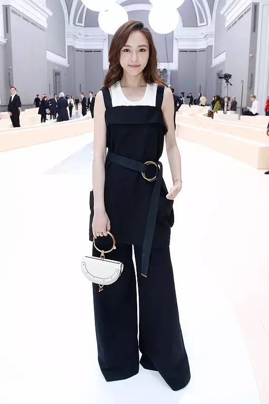 ▲唐嫣身穿黑色金属圆圈腰带装饰连体裤,内搭白色背心,手拿Nile金属手环包。全身单品均来自Chloé 2017春夏系列。