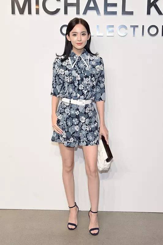 ▲古力娜扎身穿尖领印花连体裤,搭配白色腰带,脚踩深蓝色一字带高跟凉鞋亮相秀场。