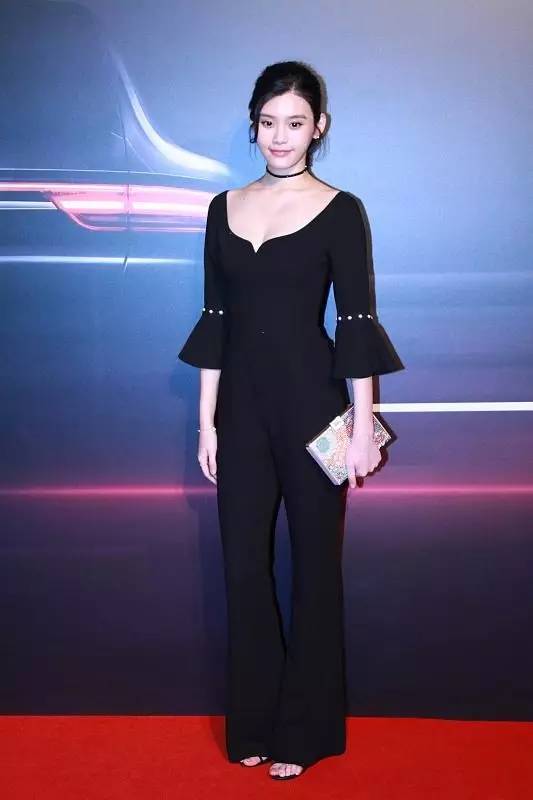 ▲奚梦瑶的另一身连体裤造型则是由黑色深V荷叶边连体裤搭配手拿包组成,实力演绎“胸以下全是腿”的摩登范儿。
