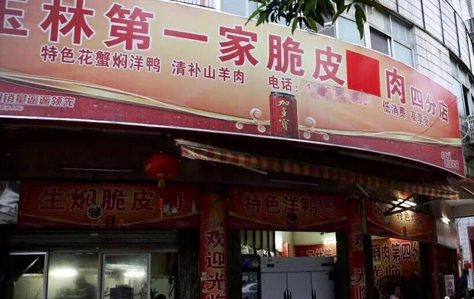 如今走在玉林的大街上,会看到贴着补丁的“X肉粉”“八仙X肉”“樟木X肉”之类的招牌,甚至连热狗都受到影响,变成了“热X”。