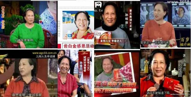 把她所有的广告串起来你会发现:不到五年的时间,孙阿姨分别患上了牙龈萎缩、牙周炎、风湿病、肺气肿、全身麻木、肝病、肾病、心脏病……每次得病都几乎生活不能自理,而每次吃了广告里的药都会神奇痊愈。