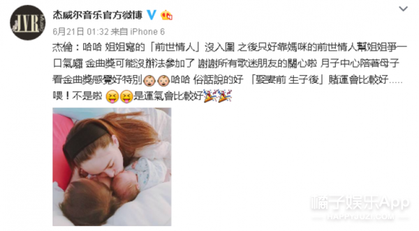 令人遗憾的是,前天周杰伦通过杰威尔音乐官方微博晒出昆凌亲吻新生儿子和女儿小周周三人的合照。周杰伦还表示:“金曲奖可能没办法参加了,月子中心陪着母子看金曲奖感觉好特别,俗话说的好'娶妻前,生子后'运气会比较好!”