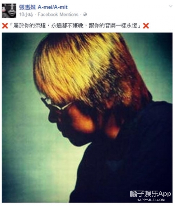 张雨生等了20年终于等到金曲奖了,虽然对于已经离世的他来说似乎为时已晚,但是张雨生的爱徒张惠妹17日在脸书PO了一张恩师的侧脸照,并写道“属于你的荣耀,永远都不嫌晚,跟你的音乐一样永恒”。张惠妹也将在明天的颁奖典礼上为大家带来特别演出。