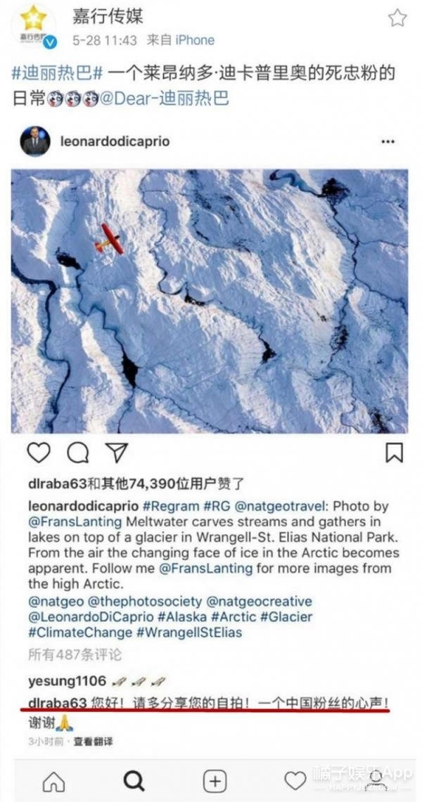 事情就发生5月28号,迪丽热巴在莱昂纳多的ins下留言,让他发自拍,没想到嘉行传媒把截图发到了微博上做宣传....