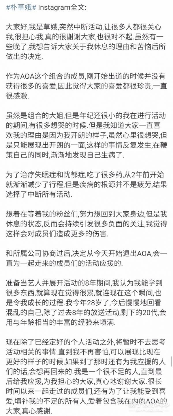 翻译帖全文,总的来说,就是她这两年换上了抑郁症,虽然最近已经减少了行程,但最后还是决定退出组合。