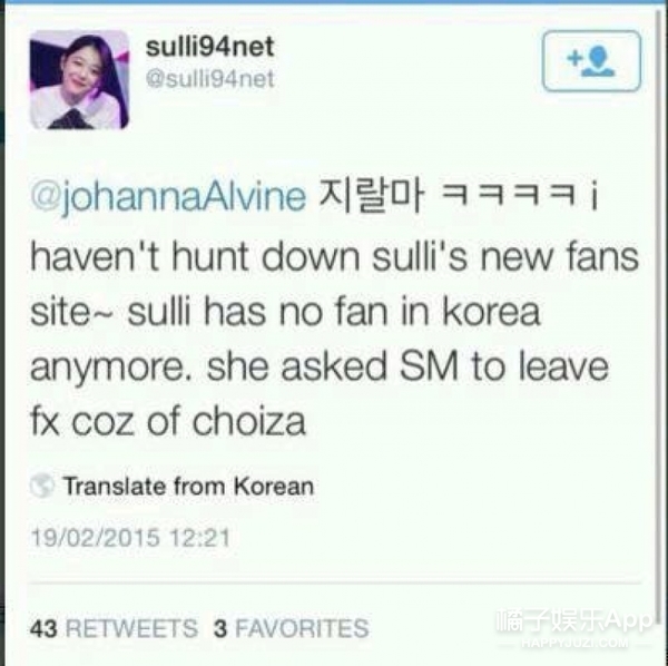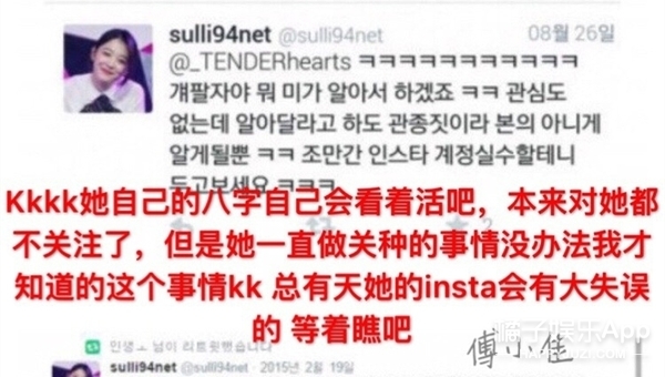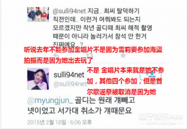还说之前雪莉不参加金唱片奖,不是因为工作,而是去玩了,首尔歌谣祭的取消也是因为她....