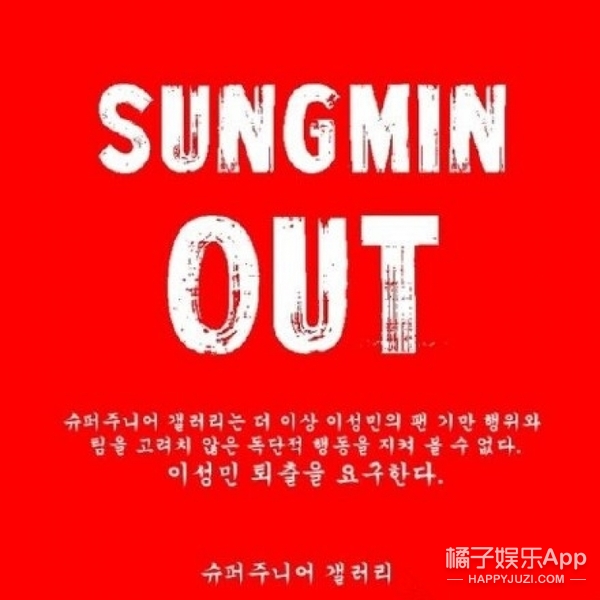 不过几天后,Super Junior的韩国DC后援站突然发出严正声明,要求成员晟敏退团,并以红底白字写下“SUNGMIN OUT”(晟敏out):