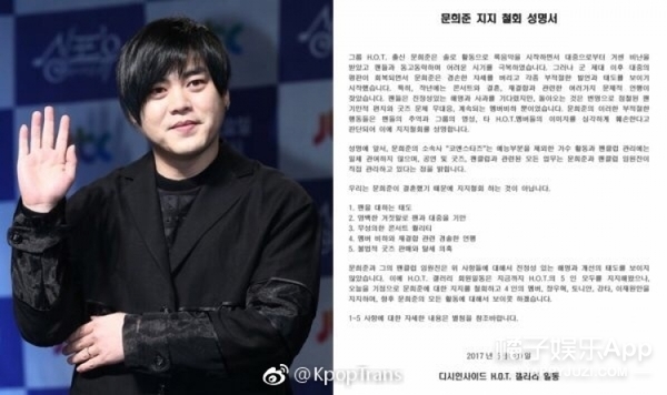 就在上个月,HOT的粉丝站DC发声明,宣布撤销对文熙俊的支持,并将联合抵制他的活动。