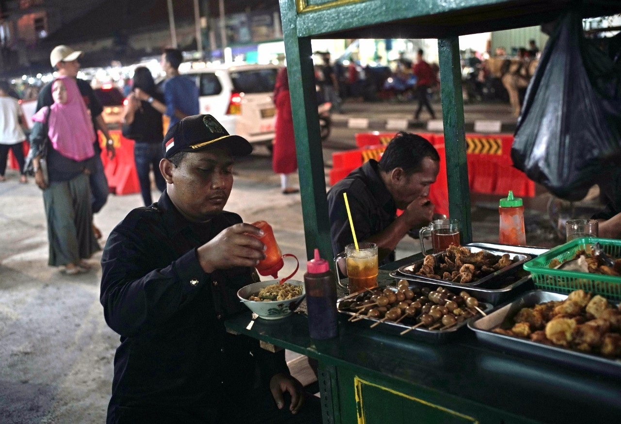 顾客在日惹的街头小摊上给食物抹上辣椒酱