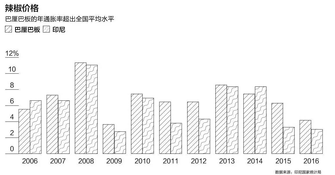 辣椒是衡量食品价格上涨的关键指标。作为印尼国民食品,辣椒可谓无处不在:从寻常的方便面晚餐到饭店的桑巴酱碟子,再到每个城镇路边摊的街头美食,到处都是它的身影。在各城市中,巴厘巴板对食品上涨的抵御力最弱。东加里曼丹省的经济建立在石油和煤炭上,价格下滑导致该省遭受重创。 2016年,印尼全国GDP增长了5%,东加里曼丹则出现萎缩。