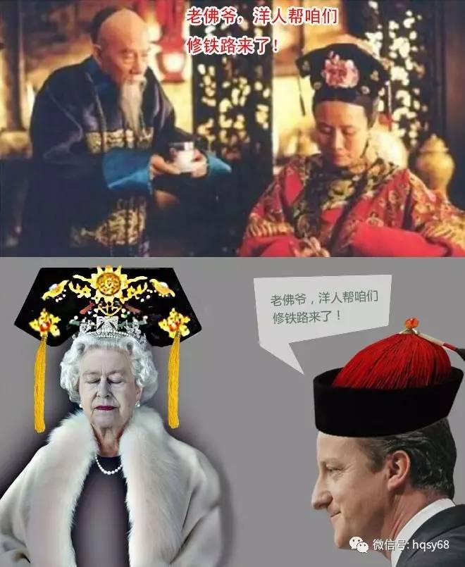 2015年,中国高铁进军英国,首相卡梅伦向伊丽莎白女王汇报,中国网友把那一幕总结成了一句话,“老佛爷,洋人帮咱们修铁路来了”。