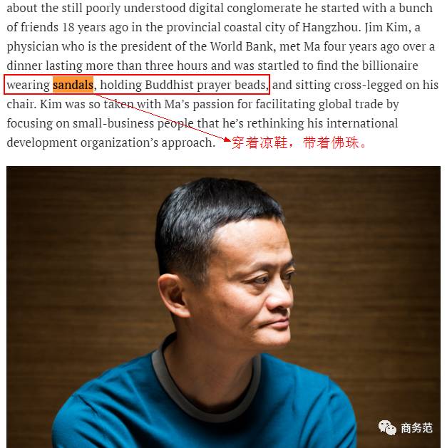 在外媒记者的描述里,中式Boy Jack Ma平时还会穿穿凉鞋啦,戴个手串儿什么的,俨然是一副古玩市场淘宝的文玩大爷风。