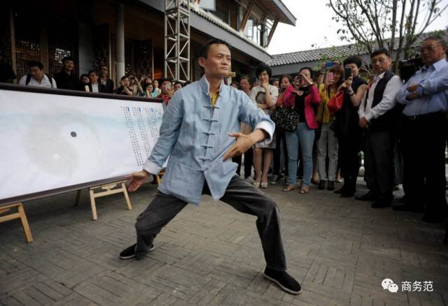 马云也是个太极爱好者,当然会穿着他的老布鞋,配上对襟马褂给大家来几招↓