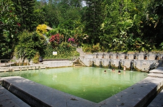 温泉在山间,一共三个池子,花木围绕,环境十分之好。那些水,也不知道是从那里来的,温热,从池边的龙头嘴里源源不绝地往外喷涌,水量大得吓人。太阳西斜的时候,印尼人民拖家带口前来泡汤,一时热闹非凡。