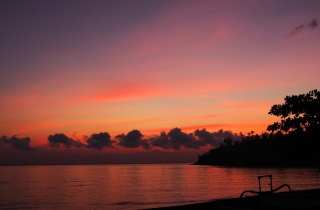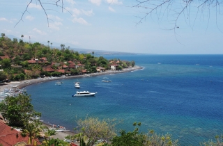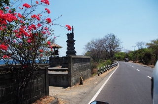 三个小时,从北部的罗威纳来到巴厘岛的最东面阿曼。一直沿着海边公路走,这是一条极美的路,有时候椰林婆娑,风情无限,有时候怪树林立,惊涛拍岸。左边是浩瀚的南太平洋,右边是白云绕顶雄伟的阿贡火山。三角梅恣肆地怒放,一路直开到海里去,似乎要把海水也染成殷红。