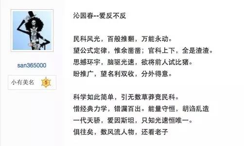 韩迪离开后,“今天开心死了”当上了“反民科吧”吧主。他发现,以前大家还会讨论自己是否掌握某个知识点、反“民科”有没有反在点子上。现在,留在贴吧里的人,更多是调侃,给“民科”列传、编故事、写打油诗、图个乐子。