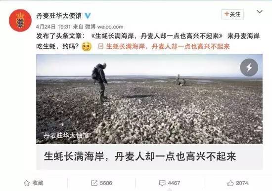 4月24日,丹麦驻华大使馆就直接发了一条微博,说丹麦生蚝泛滥,求助中国吃货们。