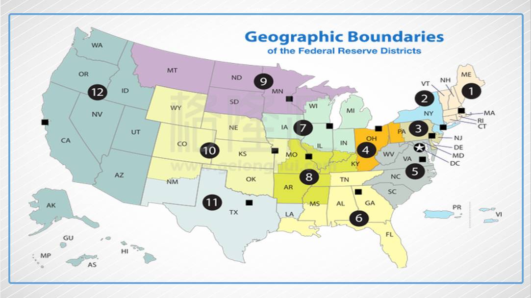 美联储在华盛顿设立了一个委员会,除此之外,把美国划分为了12个储备区,每个核心区的城市里有一个分行。每个分行的主要责任之一是研究一段时间之内这个的宏观、微观和金融市场现状。