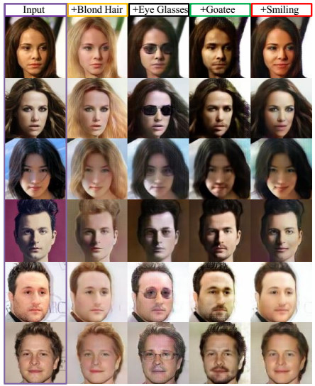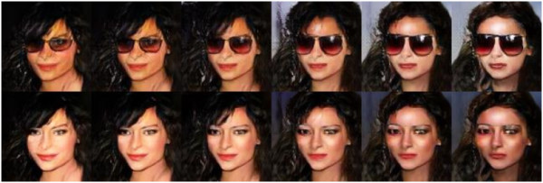 其实就是两个GAN结构,其中生成网络和判别网络中比较高层的部分都采用了权值共享(虚线相连的部分),没有全职共享的部分分别处理不同的domain。这样每次就可以根据训练的domain生成一个样本在两个domain中不同的对应,比如戴眼镜和没戴眼镜:
