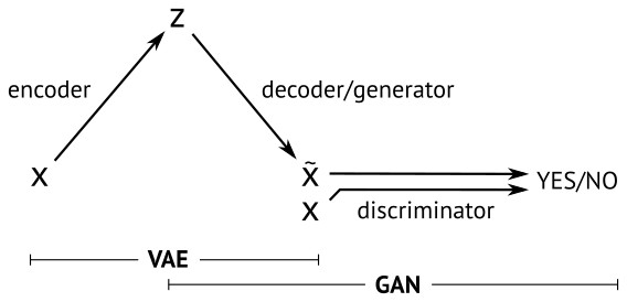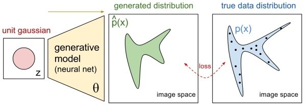 在这其中,当下最流行的就是 GAN 和 Variational AutoEncoder(VAE),两种方法的一个简明示意如下[3]: