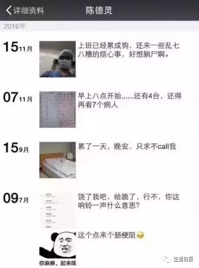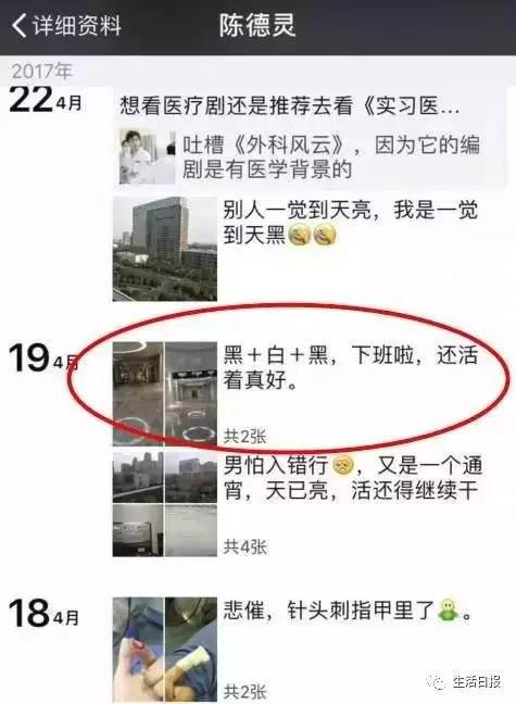 据网友提供的陈医生的朋友圈截图,其中显示:“黑+白+黑,下班啦,还活着真好。”时间为2017年4月19日。