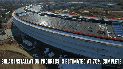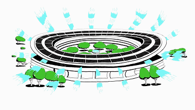 圆环的顶部全部铺设太阳能电池板,发电量17兆瓦特。当加州的阳光透过360度通透环形体,射入大楼内部,被滤去大部分紫外线和热量后的阳光,再也没有刺眼和暴晒。