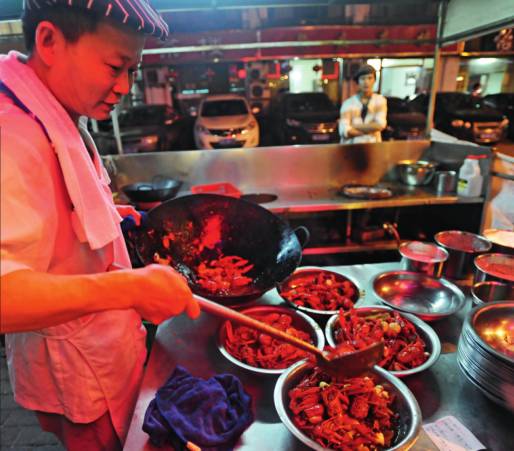 武汉,汉阳腰路堤美食街,厨师分盛刚出锅的油焖小龙虾(@视觉中国)