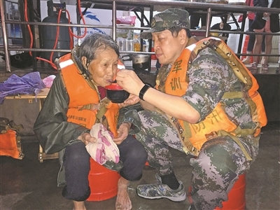 7月1日23时,广西桂林市七星区东江街道办,七星区人武部给受灾群众送来了姜汤。刚刚获救的85岁老人黄正英仍处于受惊状态。见状,现场指挥抢险的桂林警备区政委王致端着一碗姜汤来到老人身边:“我来喂您,妈妈!”一口一口,将热腾腾的姜汤用小勺喂到老人口中。老人渐渐舒缓过来,禁不住流下眼泪,拉着王致的手说:“解放军同志,你是我的亲人!”
