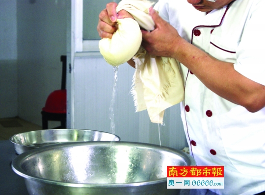 3 .冬蓉制作“脱水”工序。将过完“冷河”的冬瓜丝用麻包袋包住,再用人手挤压进行脱水。