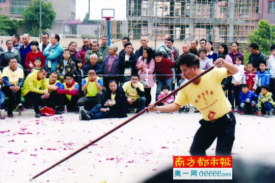 项目介绍:白眉拳主要流传于棠下镇中心金竹冈村、良溪大亨村、弓田大岭村、虎岭南溪村、华东村、周郡、石头等以及南海九江兰昌、肇庆等地。棠下白眉拳属南拳类,内外兼修,注重实战与强身健体。内讲“吞、吐、沉、浮”,手法讲究“鞭、割、挽、揪、弹、掌、顶、冲”。主要拳法有直步、铁环、石狮、三门、四门、五行、六合、地煞、九步推、十八摩、三连等;器械有单刀、双刀、梅花枪、双头枪、九子连环刀、蔡阳刀、双头棍、大耙、七星大阵棍、回环双钩等。由于白眉拳招式复杂,练功难度很大,所以往往令初学者望而却步。加之宣传力度不够,至今仍是比较小众的拳种。目前,棠下镇学习白眉拳的人有180余人。