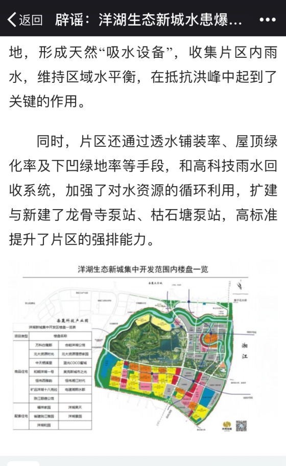 在此期间,有自媒体曝出“洋湖片区水患爆发”消息之后,长沙先导透过当地媒体对外澄清:洪水受灾严重楼盘主要属于临近洋湖生态新城集中开发范围的岳麓区含浦片区,而非洋湖,并列出了其只承认的目前长沙洋湖新城已建成及在建的18个住宅项目名单。