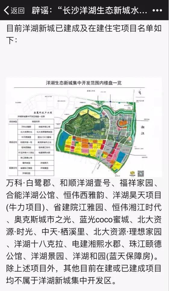 并指出,目前长沙洋湖新城已建成及在建住宅项目名单有万科·白鹭郡、和顺洋湖壹号、北大资源·时光等18个楼盘,除上述项目外,其他目前在建或已建成项目均不属于洋湖新城集中开发区。