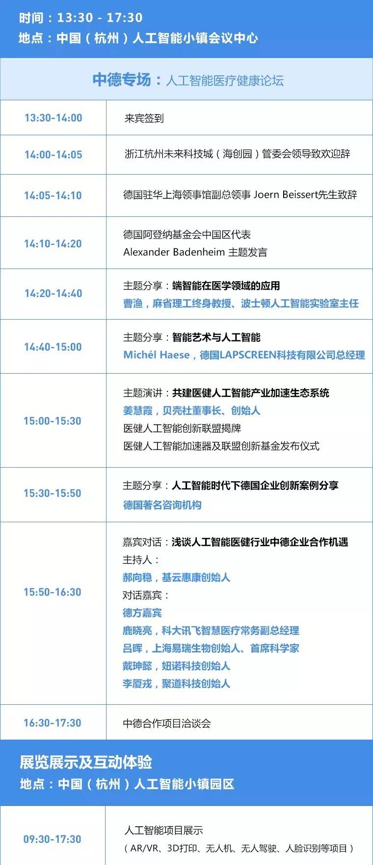 而除了上午的主论坛,7月9日当天下午,在人工智能小镇还将有近五场分论坛,部分人工智能企业也将到现场展示他们的技术和产品。届时,包括浙江大学现任校长吴朝晖、浙商创投董事长陈孟越等都将登台分享他们在人工智能方面的真知灼见。