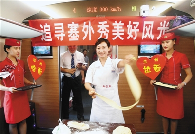 为了庆祝首发,李惠萍带领几名高姐,策划了各种小环节来和旅客互动,现场做烩面、拉牛肉面,整个车厢热热闹闹。