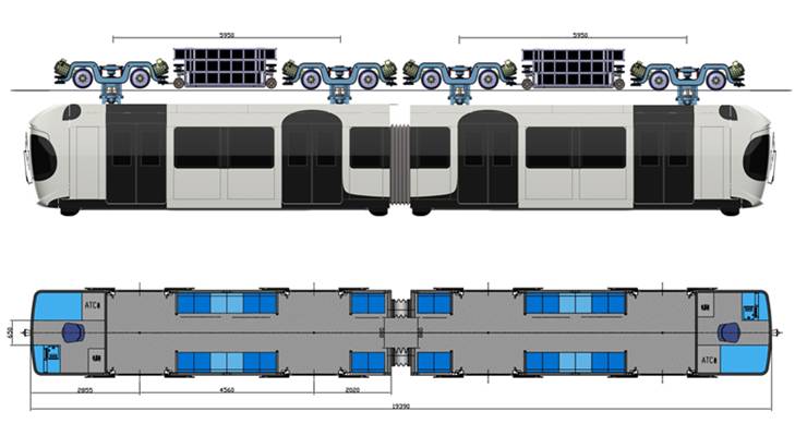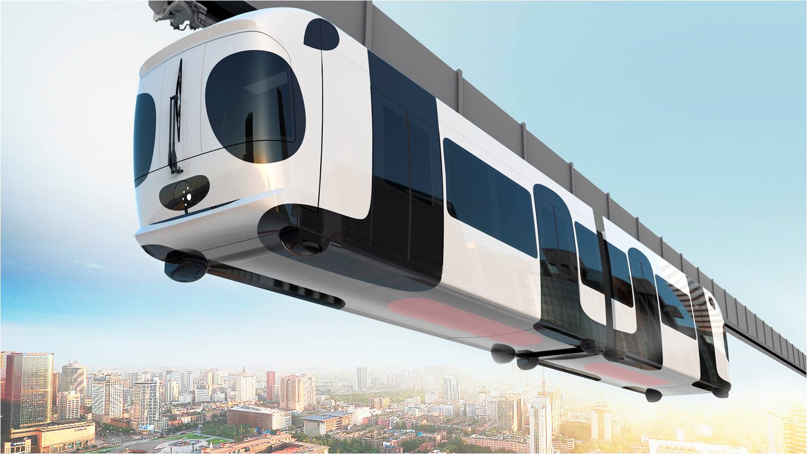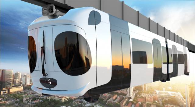 如上图所示,熊猫列车上方四个连接车体与轨道的部分即为转向架,因悬挂空中,转向架需完全隐藏在轨道里运动,此项设计填补了国内的技术空白。