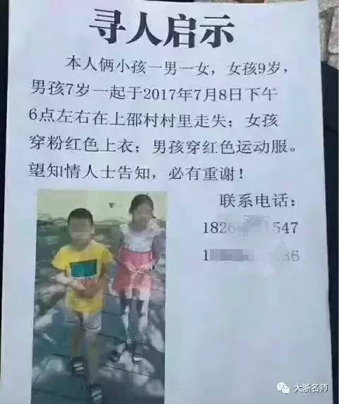 本人两小孩一男一女,女孩9岁,男孩7岁,于2017年7月8日下午6点左右在上邵村走失,女孩穿粉红色上衣,男孩穿红色运动服。