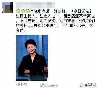 12日,有网友爆料央视主持人肖晓琳因癌症已在美国病逝,随后央视员工发文悼念证实了该消息。肖晓琳生前曾主持过《新闻联播》《焦点访谈》《半边天》《社会经纬》等多档央视节目,同时她还是《今日说法》栏目的创办人之一。