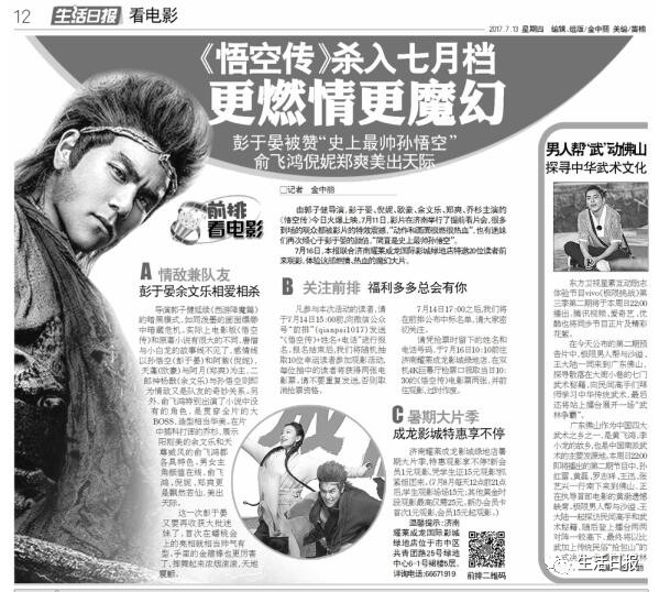 由郭子健导演,彭于晏、倪妮、欧豪、余文乐、郑爽、乔杉主演的《悟空传》将于今日火爆上映。7月11日,影片在济南举行了提前看片会,很多到场的观众都被影片的特效震撼,“动作和画面很燃很热血”,也有迷妹们再次倾心于彭于晏的颜值,“简直是史上最帅孙悟空”。俞飞鸿、倪妮、郑爽扮相俊美,飘然若仙。