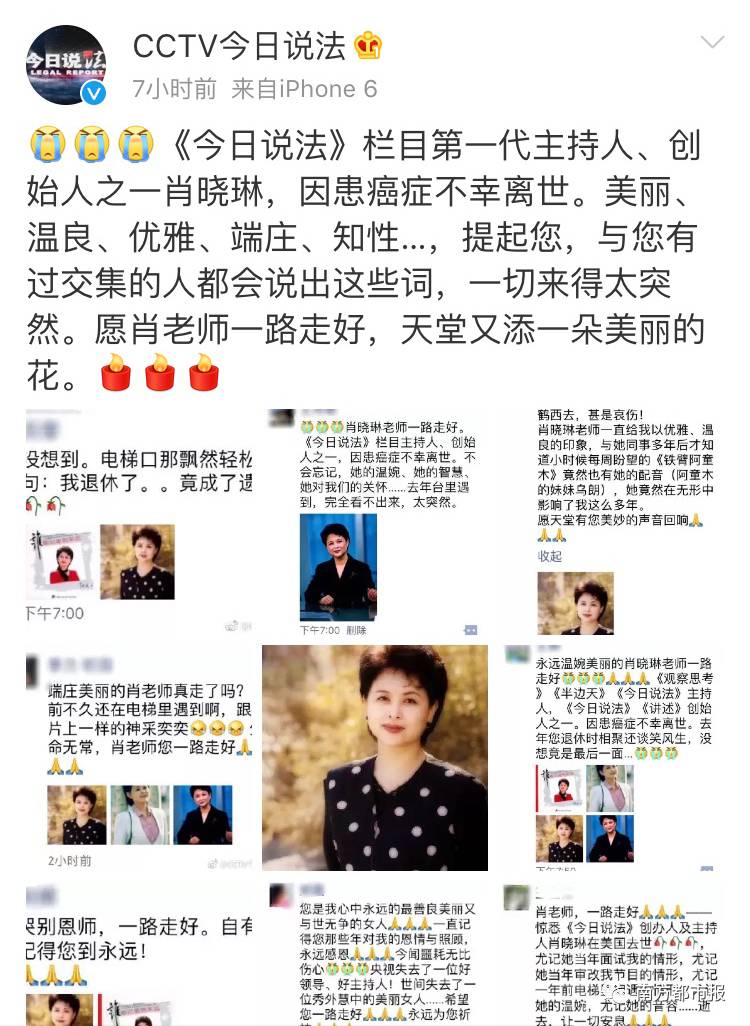 据@CCTV今日说法官方微博今日凌晨消息,《今日说法》栏目第一代主持人、创始人之一肖晓琳,因患癌症不幸离世。肖晓琳生前曾主持过《新闻联播》、《焦点访谈》、《半边天》、《社会经纬》等多档央视节目,在观众心中留下了深刻印象。据悉,今年2月份肖晓琳还曾参加中央电视台社会与法频道年会并发表了退休演讲。