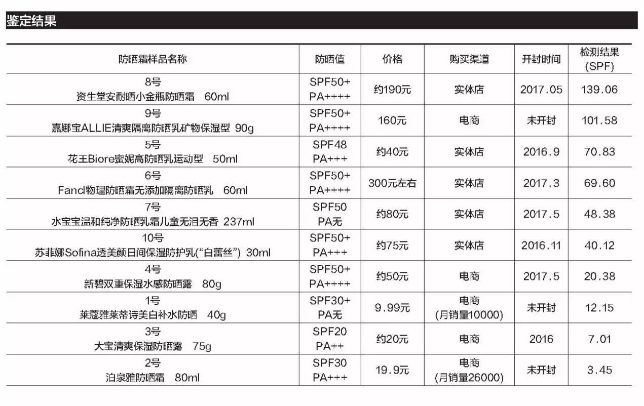 但也有不少产品检测结果让人惊喜。样品8、9,标注SPF50+,检测结果显示为139.06、101.58!样品5、6也均达到近70。剩下的样品7、10,虽检测没有到达标注值,但相差不大。