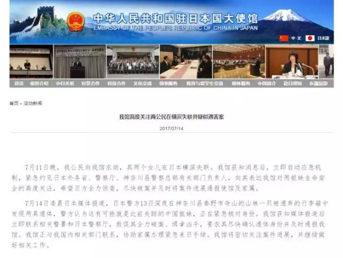 7月14日下午,中国驻日本大使馆发布消息,在日本横滨失联的中国籍姐妹二人遇害。