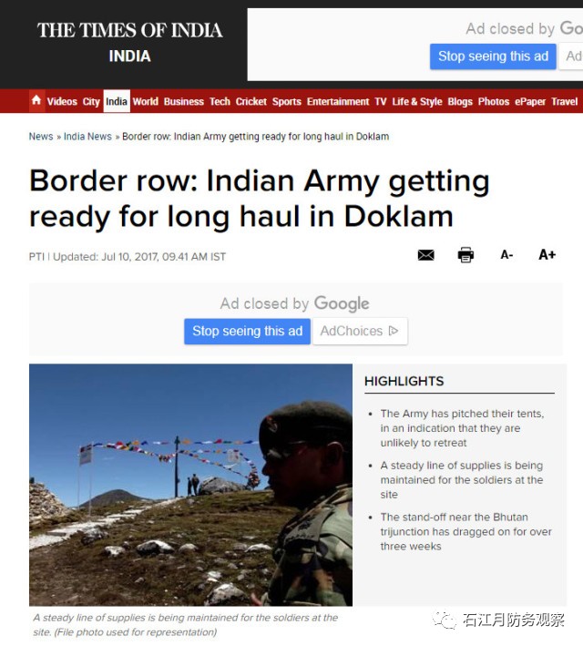 据印度报业托拉斯报道,在靠近不丹的洞朗三角地带,不久前越过中国与锡金段边界线的印度士兵竟然准备长时间待下去,他们正在“安营扎寨”建立营地。印度媒体宣称这意味着他们不太可能撤回,除非中方人员停止施工且撤出这一区域,这样才能结束这场发生在海拔大约10000英尺的“对峙”。