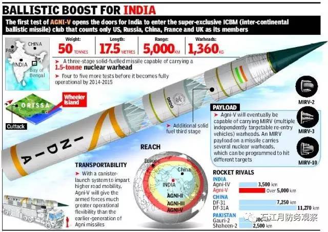 说白了,烈火-5型弹道导弹是一款以中国为目标的导弹。中国人也非常清楚烈火-5的性能,而且根据印度已经拥有了打击中国大陆大部分目标(包括北京)的导弹能力,中国会评估自己对印防务战略应该做出什么样的调整。