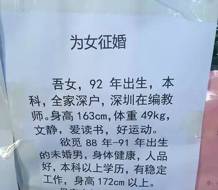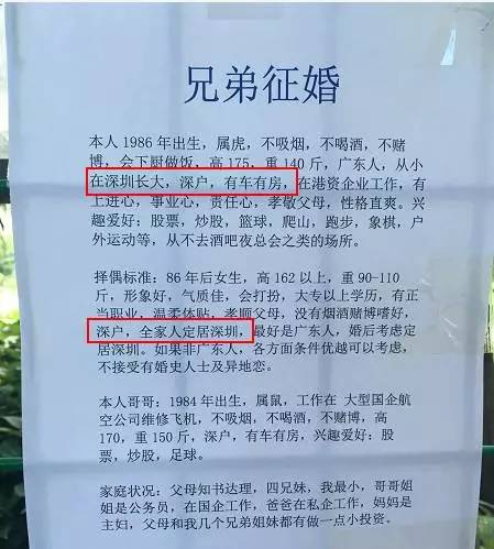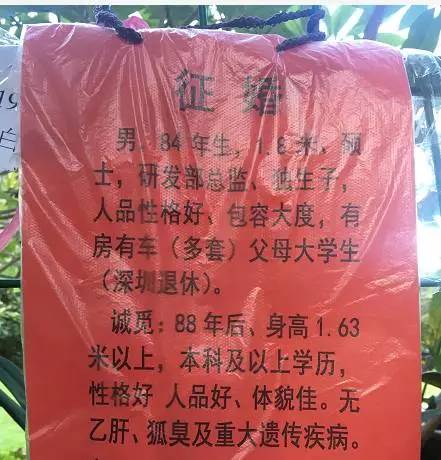 有房、深户仍是最常见字眼作为中国单身人口最多的城市,深圳当然也有类似的相亲角。