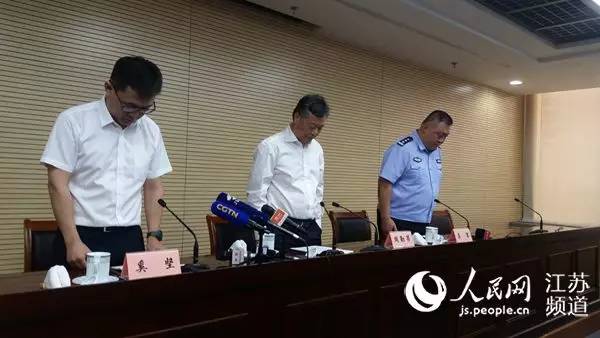 常熟市委副书记、市长周勤第(中),常熟市委常委、政法委书记吴军(右)及常熟市委宣传部副部长奚坚在发布会上默哀。