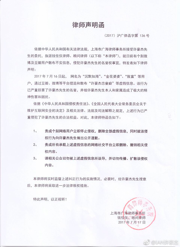 18日下午,许豪杰贴出律师函,称网友“沉默如海”等捏造和散布“许豪杰恋童癖”等虚假信息,责成立即停止侵权。
