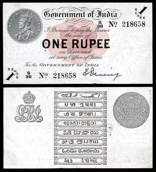 (1917年的印度卢比,上书多种语言文字,现藏于美国国家历史博物馆,图片源自@维基百科)