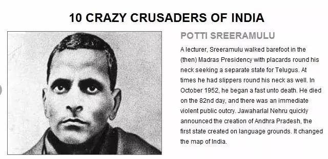 1949年,老国大党人波提·斯利马穆卢(Potti Sriramal)在马德拉斯泰卢固语地区掀起运动,要求建立泰卢固语安得拉邦。1952年,斯利马穆卢绝食58天后饿死,在泰卢固语地区引发大规模骚乱,尼赫鲁在斯利马穆卢死后第四天被迫宣布设立泰卢固语的安得拉邦。